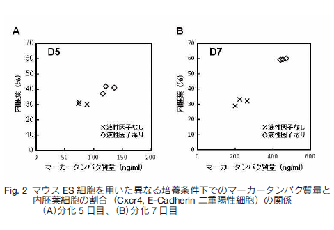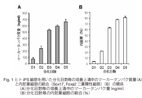 本キットを用いて培養上清中のマーカータンパク質を検出することで、ES/iPS 細胞から分化した内胚葉細胞の分化度を測定することができます。このマーカータンパク質は内胚葉マーカーである Sox17、Foxa2 二重陽性細胞率と相関します。本キットでは培養上清中のマーカータンパク質を ELISA(Enzyme-Linked ImmunoSorbent Assay)法により検出するため、細胞を損なわず継続培養しながら分化の状態をモニターすることが可能です。また、多検体の測定に用いることができるため、分化誘導剤などの薬剤スクリーニングにも有用と考えられます。
