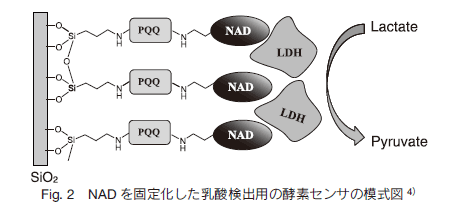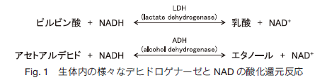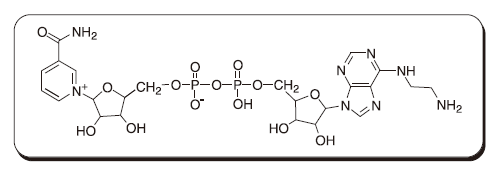 N6-2AE-NAD![]() NAD (Nicotinamide Adenine Dinucleotide)は生体内で様々な脱水素酵素(デヒドロゲナーゼ)の補酵素として重要な働きをしています。例えば、乳酸脱水素酵素(LDH)による乳酸のピルビン酸への変換や、アルコール脱水素酵素(ADH)によるエタノールのアセトアルデヒドへの変換において電子の授受に関わっています(Fig. 1)。 ![]() 小社では現在、反応性基を導入した補酵素の開発を進めており、N6-2AE-NAD は NAD のアデニンのN 6 位にアミノエチル基を導入した誘導体です。末端のアミノ基を介して電極やタンパク質などに共有結合で固定化することが可能です。酵素による NAD+ の NADH への還元率を 100 としたときに、N6-2AE-NAD は、80 ほどの還元率を保持していることが報告されています 1, 2, 3)。 ![]() N6-2AE-NAD にご興味のある方は、小社までお問合せ下さい。