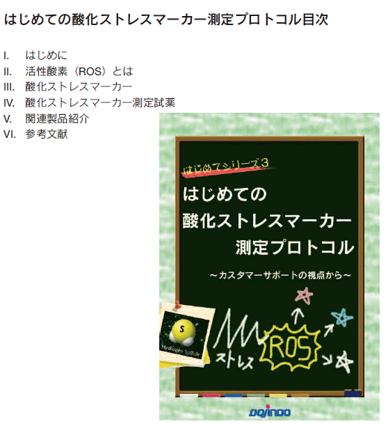 この度、第三弾として「はじめての酸化ストレスマーカー測定プロトコル」を作成いたしました。酸化ストレスマーカーの種類、小社製品を使用しての測定方法などをまとめたプロトコルです。
