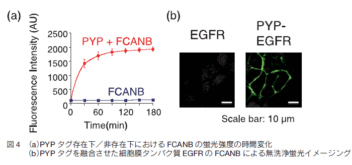 次に、FCANB を用いて、生細胞に発現させた PYP タグ融合タンパク質を洗浄操作なしでイメージングできるかを検討した。 PYP タグには、膜タンパク質の一種である EGFR (上皮成長因子受容体)を融合させ細胞膜上に発現させた。プローブをその発現細胞に添加し、細胞洗浄することなくそのまま共焦点蛍光顕微鏡観察を行った。その結果、細胞膜上から強い蛍光シグナルが観測された(図 4b)。一方、細胞内や培地からはほとんど蛍光が観測されなかった。このことから、生細胞においても特異的に標識反応が起こることが示された。以上により、プローブの反応速度を大きく向上させた発蛍光プローブを用いることで、生細胞膜上の PYP タグ融合タンパク質を洗浄することなく高感度に観測することに成功したといえる 13) 。