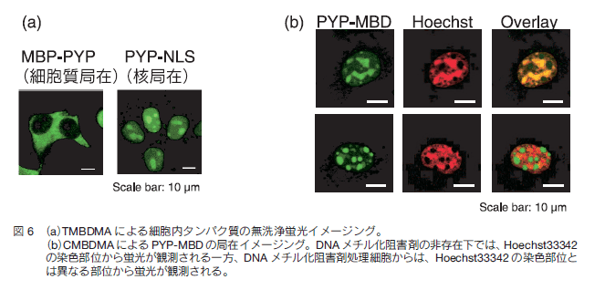最後に、著者らは、PYP タグを用いた標識技術を細胞核内の DNA メチル化のイメージングに応用した。DNA メチル化は、遺伝子発現を制御する重要な化学修飾であり、その修飾反応は DNA メチル転移酵素により触媒され、CpG 配列を持つシトシンの 5 位がメチル化されることが知られている 15) 。まず、メチル CpG に結合するタンパク質である MBD1(MethylCpG-binding domain 1)と PYP タグの融合遺伝子 PYP-MBD を細胞に導入し発現させた。 TMBDMA または CMBDMA を添加し洗浄操作を行わずにイメージングを行ったところ、核内からドット状の蛍光が複数観測され(図 6b)、また、その蛍光は、Hoechst の蛍光と局在が重なった。一般に、Hoechst は、核内のヘテロクロマチンと呼ばれる DNA メチル化の亢進した領域を染色することが知られていることから 16) 、PYP-MBD は、ヘテロクロマチン領域に局在化していることが示唆された。更に、DNAメチル化阻害剤である 5-AzadC を添加し、イメージング実験を行ったところ、PYP-MBD に結合したプローブの蛍光は、Hoechst 染色部位とは異なる位置から観測された。このことは、DNA メチル化阻害剤非存在下では、PYP-MBD が DNA メチル化領域に結合しており、DNA メチル化の阻害に伴う DNA のメチル化レベルの低下により、DNA から解離し局在を変化させたと考えられた。このように、本技術は、DNA メチル化解析に応用することができ、DNA メチル化阻害剤の生細胞評価ツールとしても利用できると期待される 17) 。