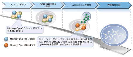 マイトファジーは酸化ストレスや DNA 損傷等により不良化したミトコンドリアを選択的に除去するシステムです。本キットの低分子蛍光プローブは、細胞内のミトコンドリアに集積し共有結合により固定化され、マイトファジーが誘導されると蛍光が増強し可視化できます。