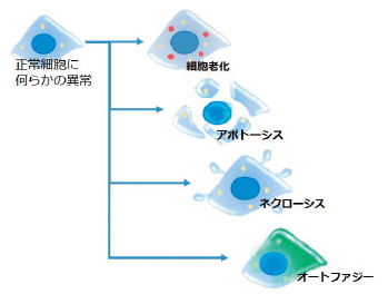 細胞老化は、アポトーシスやネクローシス、オートファジーと並び、細胞の生存および死を制御する重要な細胞応答の一つです。近年、細胞老化が個体の老化やがん等の疾病、ステムセルエイジング(幹細胞老化)にも関与していることが示され、注目されています。