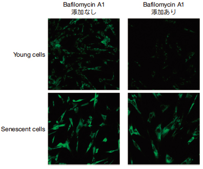蛍光検出が可能なことから、X-gal 法では適用できなかったフローサイトメトリーも利用することができ、定量性のあるデータを取得できます。また、X-gal 法では細胞を固定化する必要がありましたが、本キットでは生細胞に利用でき、簡便な操作で老化細胞を染色することが可能となりました。