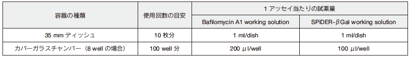 細胞に Bafilomycin A1 を加え内在性 β- ガラクトシダーゼを抑制後、SPiDER-β Gal を加え蛍光顕微鏡観察やフローサイトメトリーに利用します。固定化細胞を用いる場合は、バッファー置換により内在性 β-ガラクトシダーゼの抑制を行います。詳細は取扱説明書をご覧ください。