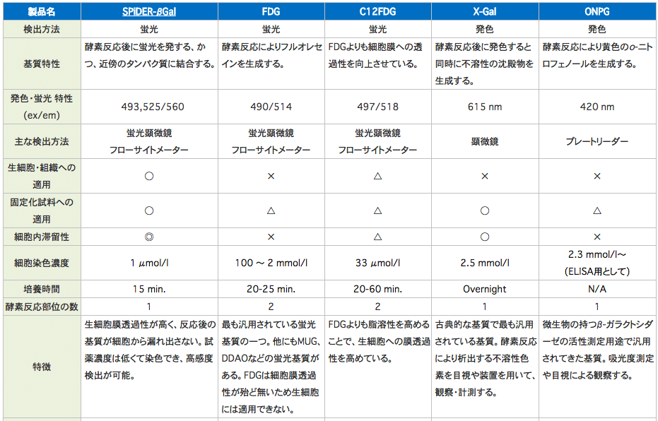 レポータージーンアッセイ等において幅広く利用されている β- ガラクトシダーゼ基質の X-Gal をはじめ、最新の蛍光基質の特徴と原理について紹介しています。基質ごとに適応可能な装置やサンプルを一覧表に示しているので、目的に応じて試薬を選択いただけます。