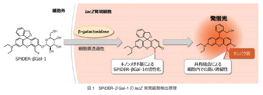 目的とする遺伝子の発現状態を可視化する技術としてレポータージーンアッセイが広く用いられている。レポータージーンの中でもβ-ガラクトシダーゼを発現する遺伝子(lacZ)は古くから使用されており、染色試薬である 5-Bromo-4-chloro-3-indolyl β-D-galactopyranoside(X-gal)を用いることにより、lacZ 発現細胞を青く染色することができる。しかし、細胞を固定化処理する必要があり、生細胞に適用することはできない。また、比色であるために他の色素との重ね合わせが難しく、組織試料において一細胞レベルでの検出は困難である。そこで、本トピックスでは上記の課題を克服した新規蛍光プローブSPiDER-β Gal-1 について紹介する。