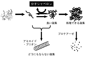 | Fig.1 Three kinds of aggregates that can be generated in the cells. ”Good aggregate” is the aggregate that can be resolubilized by aid of molecular chaperones. “Manageable aggregate” is digested by proteases. ”Difficult aggregate” is not amorphous aggregate but has some ordered structure, likely β sheets. It is resistant to protease digestion and detergent solubulization. |