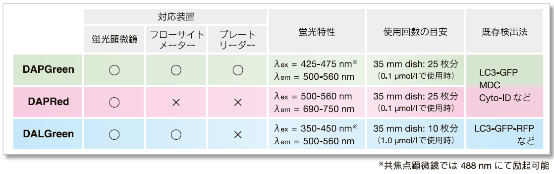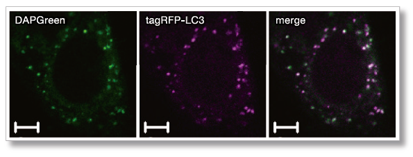 オートファジーは、細胞内の不要なタンパク質・細胞内小器官等の再利用や代謝のための分解機構としての様々な疾患への関与が示唆されています。DAPRed,DAPGreen,DALGreen は培養細胞に添加するだけで簡便にオートファジーを検出できる蛍光試薬です。