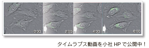 DALGreen で染色後の HeLa 細胞をアミノ酸不含培地にて培養を開始し、6 時間までの細胞および蛍光像の変化を観察しました。その結果、オートファジーを誘導した細胞において、DALGreen の蛍光の増大が確認されました。