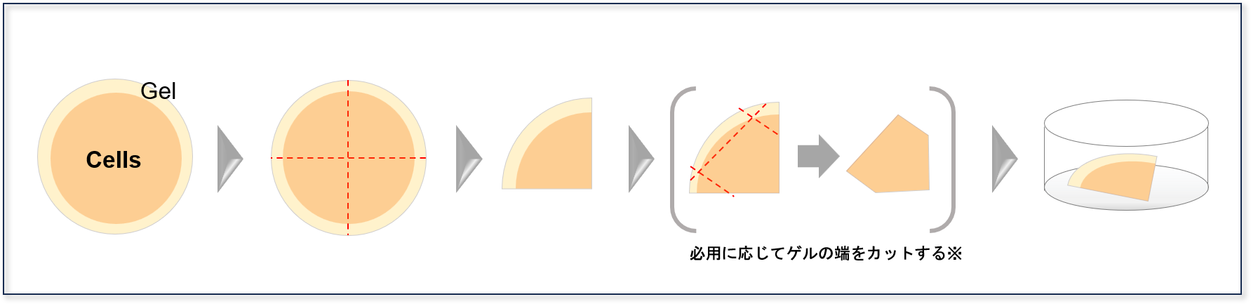 ※35mm dishの場合、ゲル(直径約40 mm)を4等分すると1つのゲルで4回分観察可能です。2. カットしたゲルをスパーテル等を使用して傷つけないように移す。