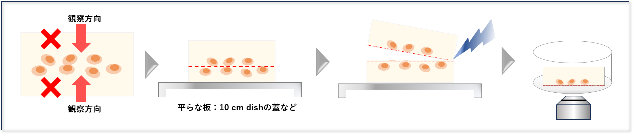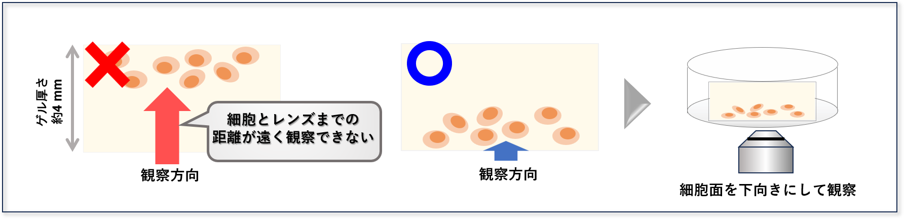 ・スライスしたゲルは、切断面を下にして観察容器へ移し観察する。細胞がゲルの中心付近に位置することでひっくり返しても観察できない例と対処法