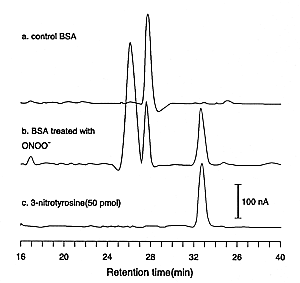 Fig. 4. HPLC-EC analysis of (a) acid hydrolysate of control BSA, (b) acid hydrolysate of BSA treated with ONOO- (2 mM), and (c) authentic 3-nitrotyrosine (50 pmol) detected with applied potential of 720 mV.