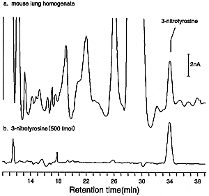 Fig. 5. Nitrotyrosine formation in mouse lung infected with influenza virus infection. (a) acid hydrolysate of lung homogenate (7 days postinfection) analyzed by HPLC-EC at 700 mV, (b) authentic 3-nitrotyrosine (500 fmol).