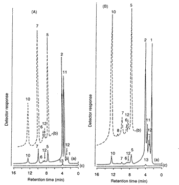 acid;10=ƒ¿-keto-b-methylvaleric acid;11=glyoxylic acid; 12=unidentified; 13=DDB. Column: