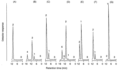 Fig.5 . Chromatograms obtained with sera from :(A) human;(B) horse; (C) swine; (D) rat; (E) bovine; (F) sheep;and (G) mouse.Peaks: 1=NGNA;2=NANA;3=DMB;4-6=unknown.Column: Radial-Pak C18(5m;100~8mm I.D.).Mobile phase:methanol-acetonitrile-water(25:4:91,v/v).Flowrate:1.2ml/min.