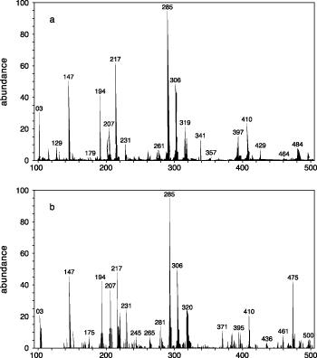Fig.4 Mass spectra of the derivatives from authentic 3-DG and rat plasma. a:authentic 3-DG, b:rat plasma. Each derivative was isolated by HPLC and applied to GC/MS.