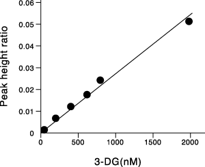 Fig.5 Linear relationship of 3-DG concentration vs peak height ratio(3-DG-derivative/internal std.-derivative).