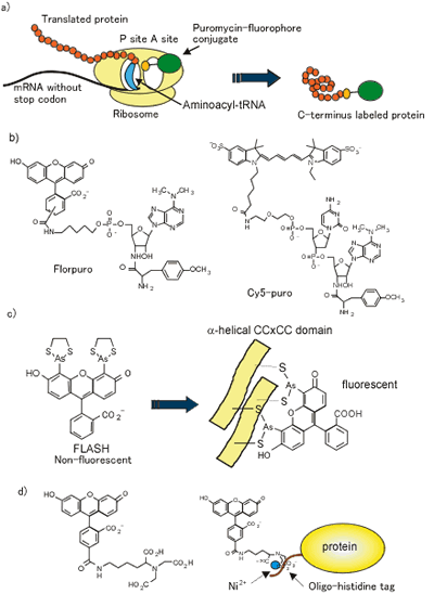 a) Outline of fluorescent-labeling with puromycin-fluorophore conjugate
