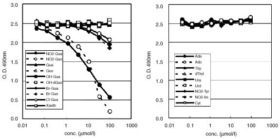 下図はプレートに固相化した8-ニトログアノシン結合BSA(NO2-Guo-BSA)と各種の物質に対する、本抗体の反応を競合法ELISAで検定したものです。8-ニトログアノシンと8-ニトログアニンに対してのみ、競合物質の濃度に依存した右下がりの曲線を与え、本抗体が反応していることを示しています。他のヌクレオシド等は反応しないため、競合物質の濃度に関係なく本抗体は固相化したNO2-Guo-BSAに反応し、ほぼ一定の値を示します。