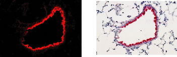 Fig.1 インフルエンザウィルス感染マウスの肺上皮組織切片を8-ニトログアノシンポリクローナル抗体と蛍光(Vector Red)標識抗マウス抗体によって免疫組織染色した画像。