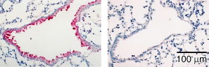 Fig.3 インフルエンザウィルス感染マウスの肺上皮組織。左は8-ニトログアノシンポリクローナル抗体による免疫組織染色画像。右は染色時にニトログアノシンを添加した吸収試験画像。
