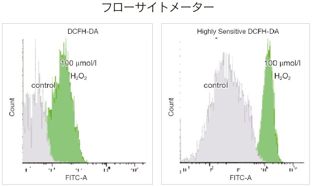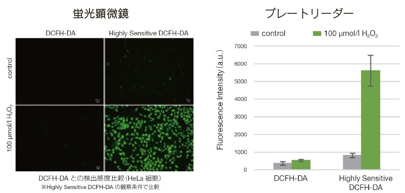 本製品は ROS(Reactive Oxygen Species)を蛍光プレートリーダー、蛍光顕微鏡、もしくはフローサイトメーターを使って蛍光法により検出するキットです。一般的にROS により酸化されることで発蛍光するDCFH-DA が使用されますが、本キットに含まれる蛍光基質は細胞膜透過性が高く、DCFH-DA と比較してより高感度に ROS を検出することができます。また、DCFH-DA と同等の蛍光波長を有することからDCFH-DA と同じ検出器やフィルターを使用することができます。