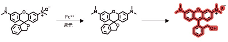 Lyso-FerroRedは細胞内のリソソームの遊離二価鉄を検出することができます。試薬を培養細胞に添加すると細胞膜を透過し、リソソームのFe2+と選択的に反応して強い蛍光を発します。Lyso-FerroRed にはキレート能はなく、Lyso-FerroRed とFe2+は非可逆的に反応するため、Fluo 3 のようなカルシウム蛍光プローブの検出原理とは異なります。