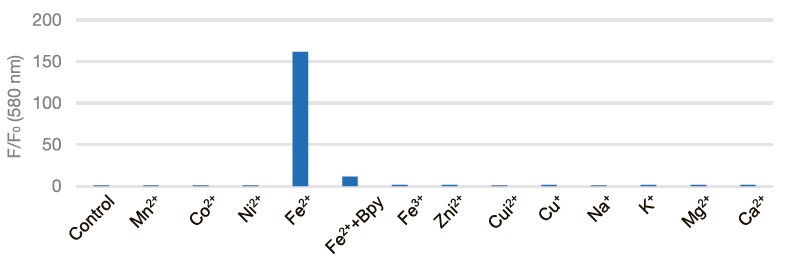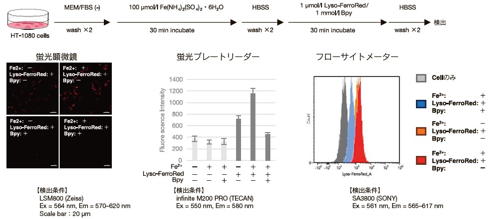 硫酸アンモニウム鉄(II)六水和物を用いてHT-1080 細胞に二価鉄を取り込ませ、各方法でリソソームの二価鉄を検出しました。その結果、いずれの検出器においても、二価鉄の取り込みによって細胞の蛍光強度が上がり、二価鉄のキレート剤Bpy(2,2’-Bipyridyl)との併用により細胞の蛍光強度が下がることが確認されました。