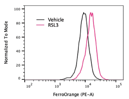 Iron overload contributes to ferroptosis through the Fenton reaction, which generates ROS that propagate lipid peroxidation14). Labile iron pools can be detected using fluorescent probes such as FerroOrange, a selective cytosolic Fe2+ indicator. This probe allows for flow cytometry, live-cell imaging and quantification of intracellular iron levels. We treated SU-DHL-5 cells with a GPX4 inhibitor, RSL3, and measured labile Fe2+. We observed that RSL3 treatment significantly increased the accumulation of labile Fe2+ level, evidenced by a marked increase in FerroOrange fluorescence in flow cytometry measurement (Figure 1). An alternative method using Calcein-AM fluorescence quenching can also measure the labile iron pool15). This method relies on the principle that Fe2+ quenches calcein fluorescence, allowing quantification of the labile iron pool. These complementary techniques provide critical insight into the iron driving lipid peroxidation and ferroptosis.