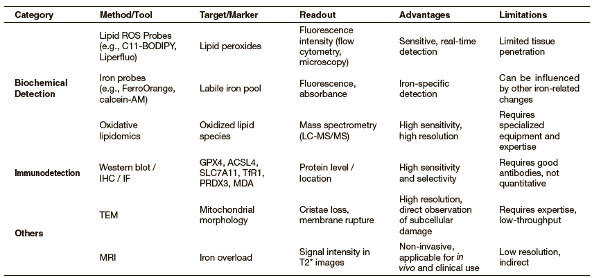 We summarize key ferroptosis detection methods, including biochemical detection, immunodetection, and other imaging methods, in Table 1. This overview serves as a practical guide for selecting appropriate tools in various experimental and translational contexts.