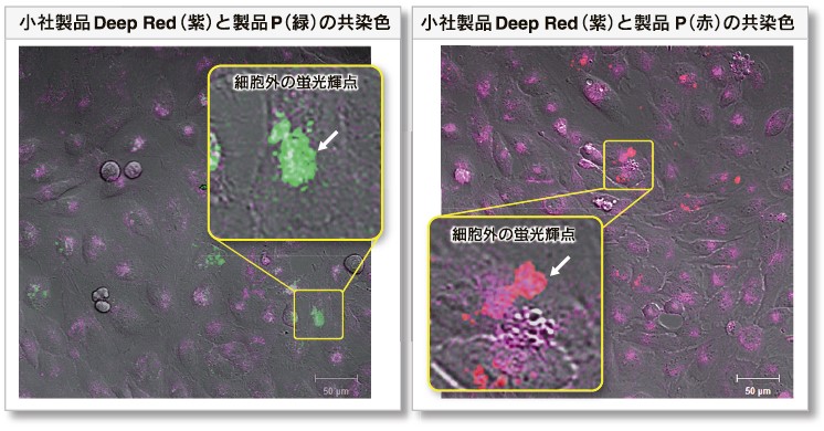 (1) ExoSparkler Exosome Membrane Labeling Kit-Deep Red及びS社製品P(緑または赤)で染色したエクソソームをHeLa 細胞へ添加し、細胞内へ取り込まれるエクソソームを蛍光顕微鏡で確認した結果、ExoSparklerシリーズでは色素の凝集が見られなかったのに対し製品P(緑または赤)で染色したエクソソームでは、色素の凝集が疑われる細胞外の蛍光輝点が確認されました。