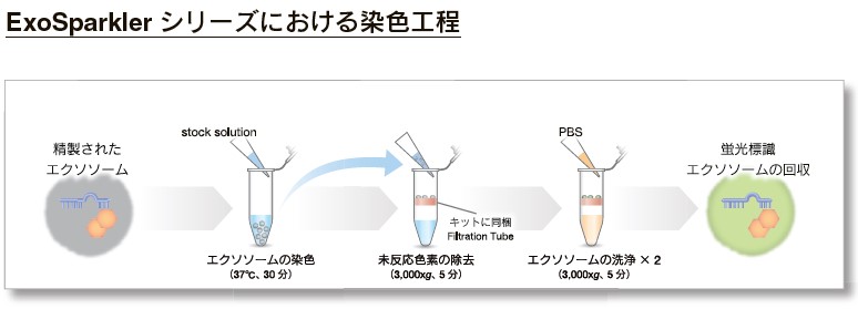 (2) ExoSparklerシリーズは、エクソソームの標識に最適化したプロトコルに加え、蛍光標識後の未反応色素を除去できるフィルトレーションチューブを同梱しているため、簡単な操作で蛍光標識エクソソームを調製できます。