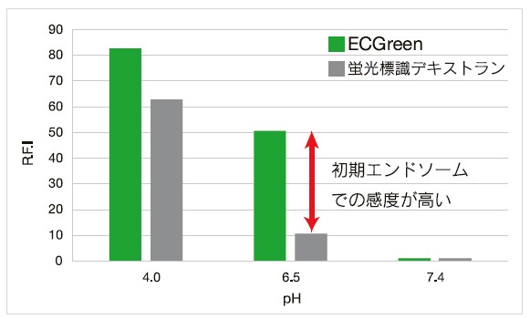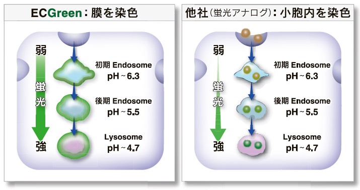 ECGreen-Endocytosis Detectionは小胞膜に局在し、pH に依存して蛍光を発する試薬で、蛍光アナログよりも直接的にエンドサイトーシスを可視化することができます。また、本品は従来用いられてきた蛍光標識デキストランと比較して、pH変化に対する応答性に優れています。そのため、初期エンドソームも高感度に検出することが可能です。