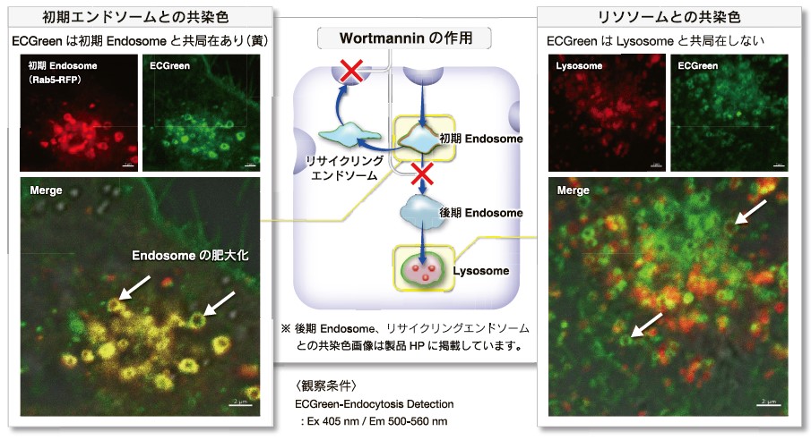 Wortmanninはエンドソームのリサイクリングやリソソームへの移行を阻害し、エンドソームの肥大化を惹起することが知られています。Wortmanninによるこれらの変化をECGreenと初期エンドソームマーカータンパク質Rab5-RFP(蛍光タンパク質)との共染色、およびECGreenとリソソーム染色試薬との共染色で確認しました。その結果、Wortmannin添加時にはECGreenは肥大化したエンドソーム(Rab5-RFP)と共局在(左図:Merge)し、リソソームとは共局在しない(右図:Merge)ことが確認できました。これらの結果から、ECGreen は細胞内小胞輸送系の変化を可視化できることがわかりました。
