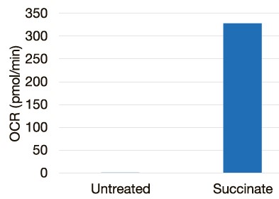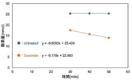 分画したミトコンドリアに Succinateを添加すると、Untreatedと比べてOCR(= グラフ直線の傾き)が増加しました。