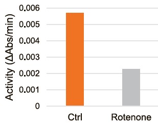 小社製品のIntactMito Fractionation Kit for Tissueを用いて、マウスの脳から分画したミトコンドリアのComplex I の活性を本キットを用いて測定しました。 Complex I 阻害剤であるRotenoneを添加するとComplex I 活性の低下が確認されました。