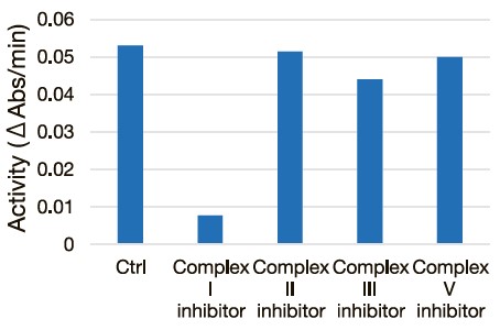 ミトコンドリア電子伝達系複合体 I、II、III、V の各阻害剤を添加したときのComplex I 活性の変化を本キットを用いて測定しました。Complex I 阻害剤を添加した条件のみ、Complex I 活性の低下が確認されました。