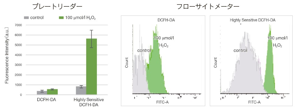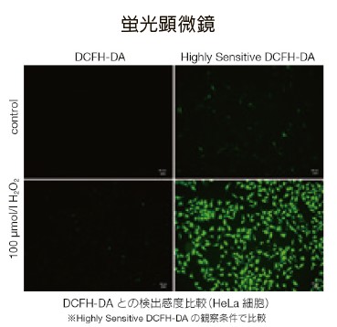 本製品は ROS(Reactive Oxygen Species)を蛍光プレートリーダー、蛍光顕微鏡、もしくはフローサイトメーターを使って蛍光法により検出するキットです。一般的に ROS により酸化されることで発蛍光する DCFH-DA が使用されますが、本キットに含まれる蛍光基質は細胞膜透過性が高く、 DCFH-DA と比較してより高感度に ROS を検出することができます。また、DCFH-DA と同等の蛍光波長を有することから DCFH-DA と同じ検出器やフィルターを使用することができます。