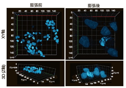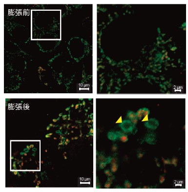 膨張前の細胞では、ミトコンドリアの外膜と内膜の判別がし難いのに対し、膨張後の細胞では、外膜がリング状(ミトコンドリア分裂)を示し、内部に内膜タンパク質が存在しない構造(黄色矢印)が観察されました。