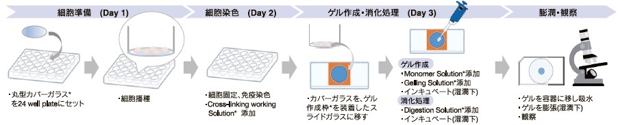 製品には実験に必要な試薬が含まれています。細胞の準備からゲル作成、観察までの詳細なプロトコルで、はじめてでも安心して実験ができます。