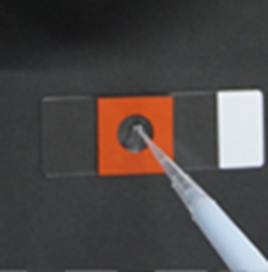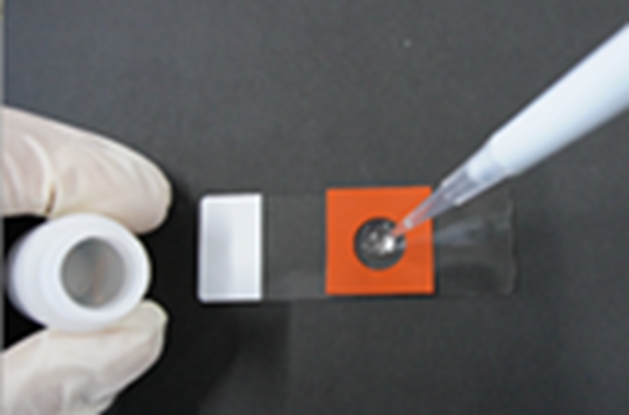 - 先端を曲げた注射針を使用し、染色操作をしたCover Glassを24-well plateから取り出し、スライドガラスに貼り付けたMoldの円内に移した。