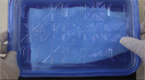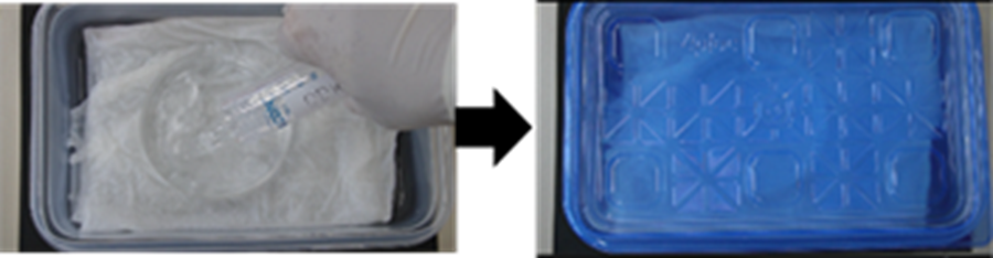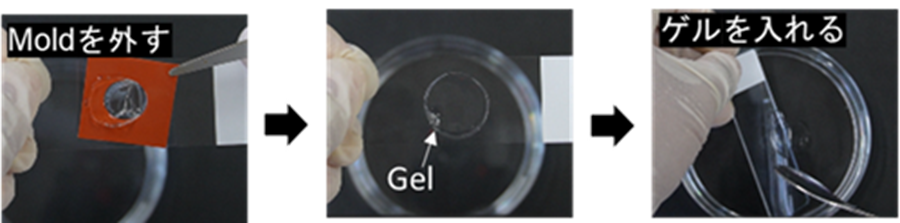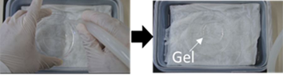 - Moldをスライドガラスから取り外した後、超純水 45 mlを入れた10 cm dishに移し、事前に37℃に温めておいたゲル膨張用湿潤容器に入れ、37℃で30分間インキュベートした。