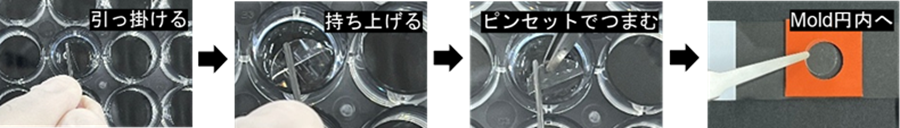 - 先端を曲げた注射針を使用し、操作5.のCover Glassを24-well plateから取り出し、操作6.のMoldの円内に移す。Cover Glassを注射針で持ち上げる際は、ピンセットで取り出しを補助すると操作が簡便になります。