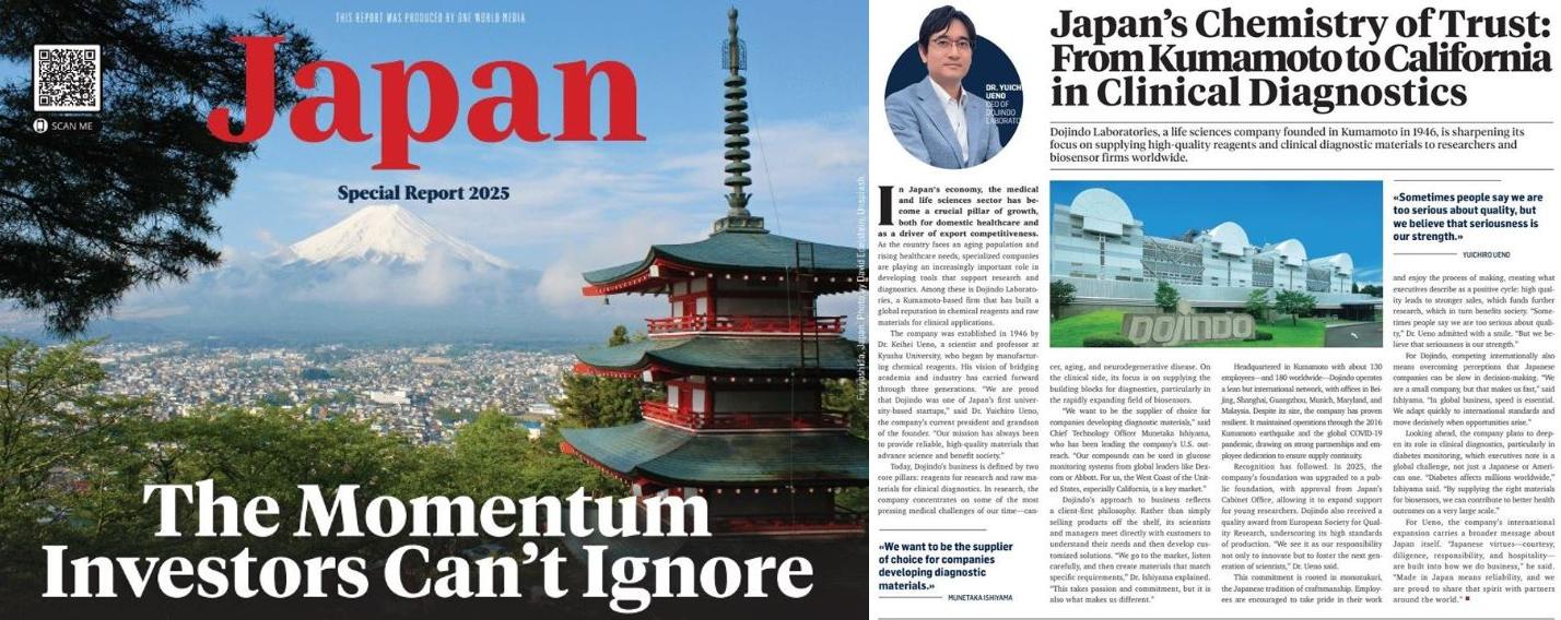 今月号は日本の特集記事「The Momentum Investors Can’t Ignore」の中で、「Japan’s Chemistry of Trust: From Kumamoto to California in Clinical Diagnostics」と題して、世界中の研究者や企業に向けて高品質な試薬や診断薬原料を供給する企業として紹介されています。