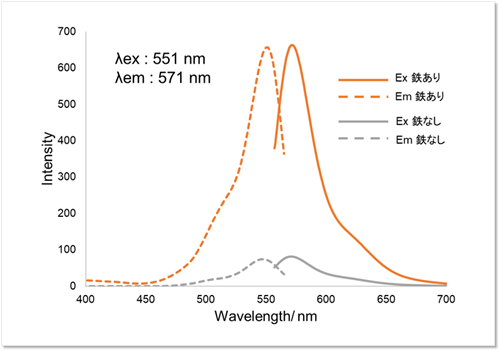50 mmol/l HEPES Buffer (pH7.4) 中にLyso-FerroRed(終濃度:2 μmol/l) 、硫酸アンモニウム鉄(Ⅱ)(終濃度:20 µmol/l)を加え室温にて1時間反応後に測定しました。