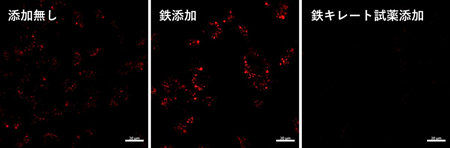 硫酸アンモニウム鉄(II)(終濃度:100 μmol/l)を添加したHT-1080細胞をLyso-FerroRedで染色後、未固定または30分間固定(4%PFA/PBS)処理し、蛍光顕微鏡にて観察しました。<検出条件>