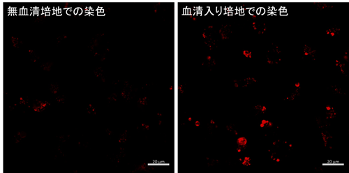 HBSSもしくは無血清培地で調製してください。血清入り培地で調製すると血清中の鉄と色素が反応し、バックグラウンド蛍光が高くなります。