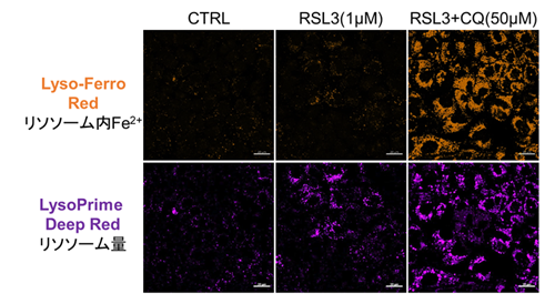 これまでがん細胞株間ではフェロトーシス感受性が異なることが示唆されており、フェロトーシス抵抗性のがん細胞においてリソソームのストレスを増加させることでフェロトーシスを促進できることが報告されている1)。フェロトーシス抵抗性を示すがん細胞、A549細胞を用いてフェロトーシス誘導剤であるRSL3またはRSL3とリソソーム阻害剤であるChloroquine(CQ)を24時間処理し、細胞生存率、リソソーム内Fe2+、リソソーム量の変化を解析した。その結果、RSL3単独で処理した場合では細胞生存率、リソソーム内Fe2+に大きな変化はみられなかったが、一部リソソームが集積している様子(LysoPrime Deep Redの強い輝点)が観察された。一方、RSL3に加えてCQを同時に処理した細胞では、リソソーム内Fe2+の増加とリソソームの肥大化、細胞生存率が低下する既報と同様の結果が得られ、フェロトーシス促進にリソソーム内Fe2+の増加が関与している可能性が示唆された。
