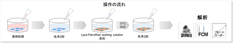 Lyso-FerroRedは血清入りの培地と接触すると血清中の鉄と反応するため、細胞を剥がすときはスクレーパーで剥がして、PBSやHBSSで回収してください。
